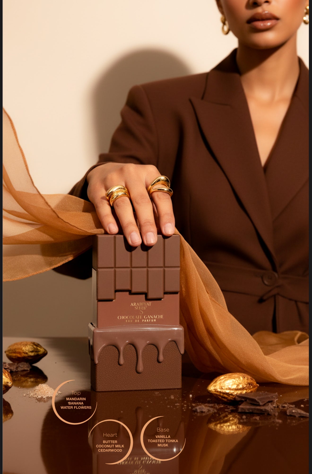 Chocolate Ganache est un parfum ultra sensuel, rond et crémeux. Comme une tablette de chocolat fondant recouverte d’un voile lacté, il dévoile une ouverture fruitée et lumineuse avant de se fondre dans un cœur beurré, riche et décadent. Les notes finales, boisées et vanillées, créent un sillage gourmand mais chic, parfait pour celles qui veulent sentir la chaleur suave d’un dessert chocolaté haut de gamme.