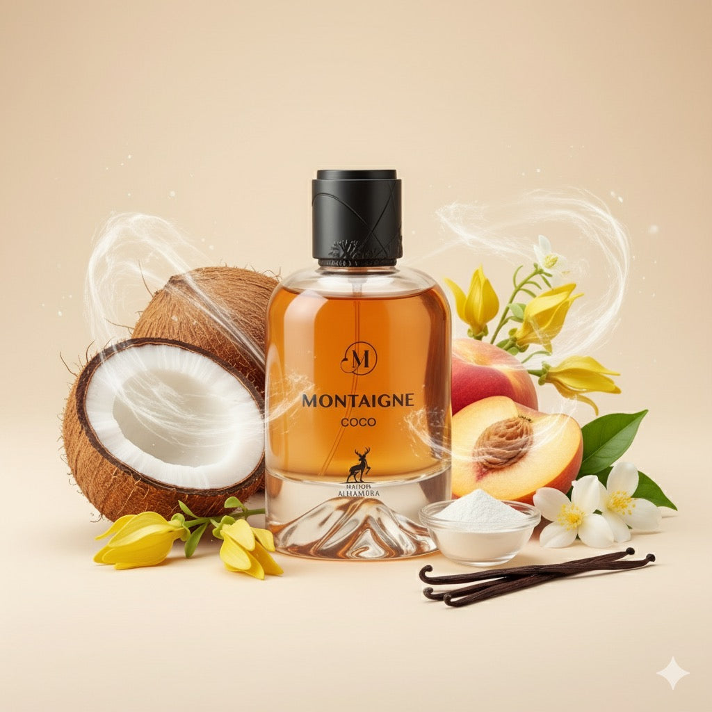 Montaigne Coco évoque le charme d’une escapade ensoleillée au bord de l’océan. Dès les premières notes, la douceur de la pêche et la sensualité de la noix de coco caressent la peau comme une brise tropicale. Les fleurs blanches se mêlent ensuite à la chaleur vanillée dans une danse lumineuse et exotique. Le musc blanc et le bois viennent ancrer ce bouquet solaire dans une élégance apaisante. À la fois suave, crémeux et raffiné, ce parfum capture la féminité radieuse d’un été éternel — un voile soyeux et lumineux, idéal pour les amoureuses des senteurs chaudes et sensuelles.