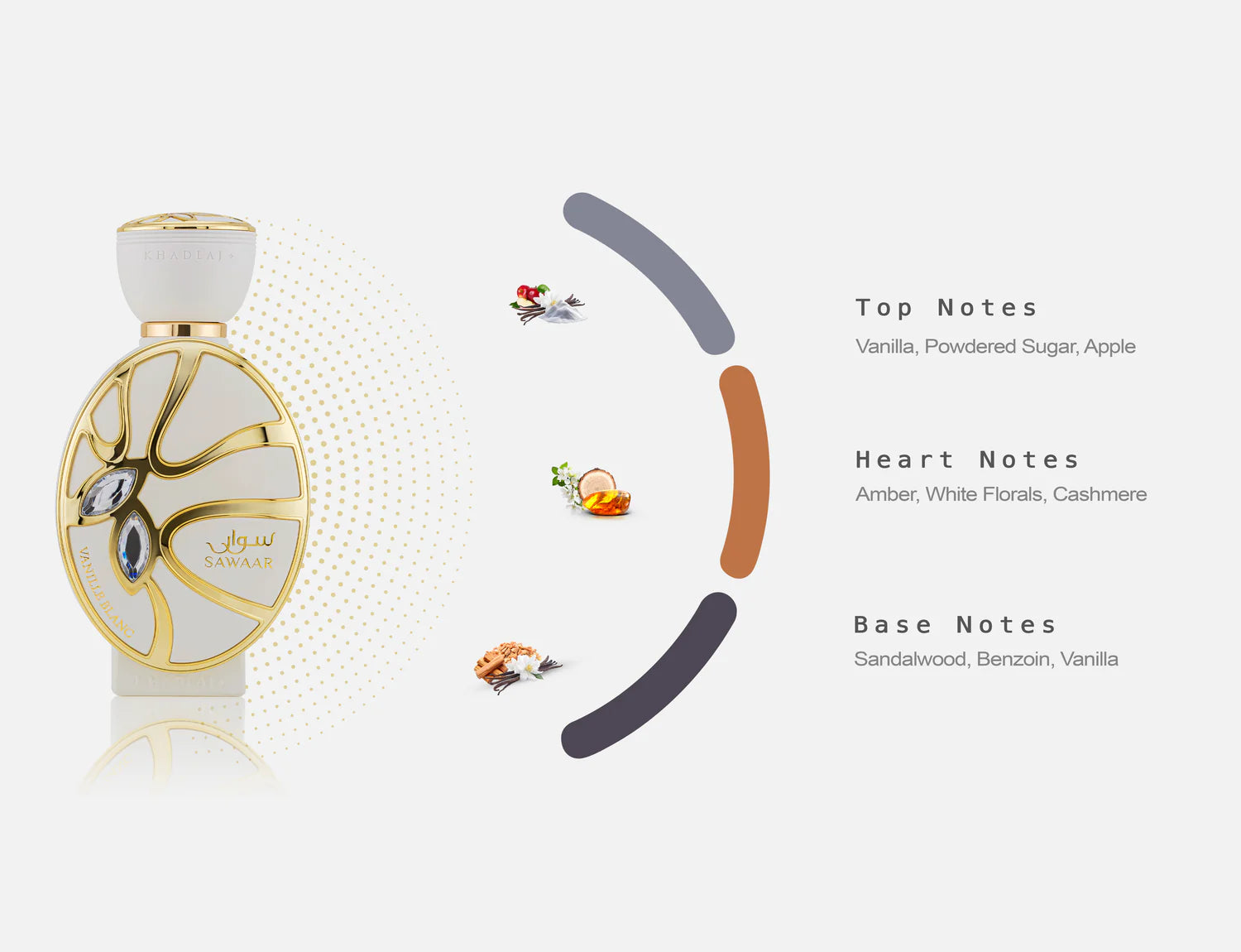 Sawaar Vanille Blanc, c’est une vanille crémeuse et lumineuse, façon douceur “cocon” super élégante. Ça s’ouvre sur une vanille sucrée, avec un effet sucre glace et une touche de pomme qui apporte un petit côté frais et gourmand. Ensuite, l’ambre et les fleurs blanches donnent une sensualité clean, et le cachemire ajoute ce côté velouté qui fait très “doudou chic”. Le fond est chaud et réconfortant : santal + benjoin + vanille, pour un sillage doux, sucré, et super addictif.